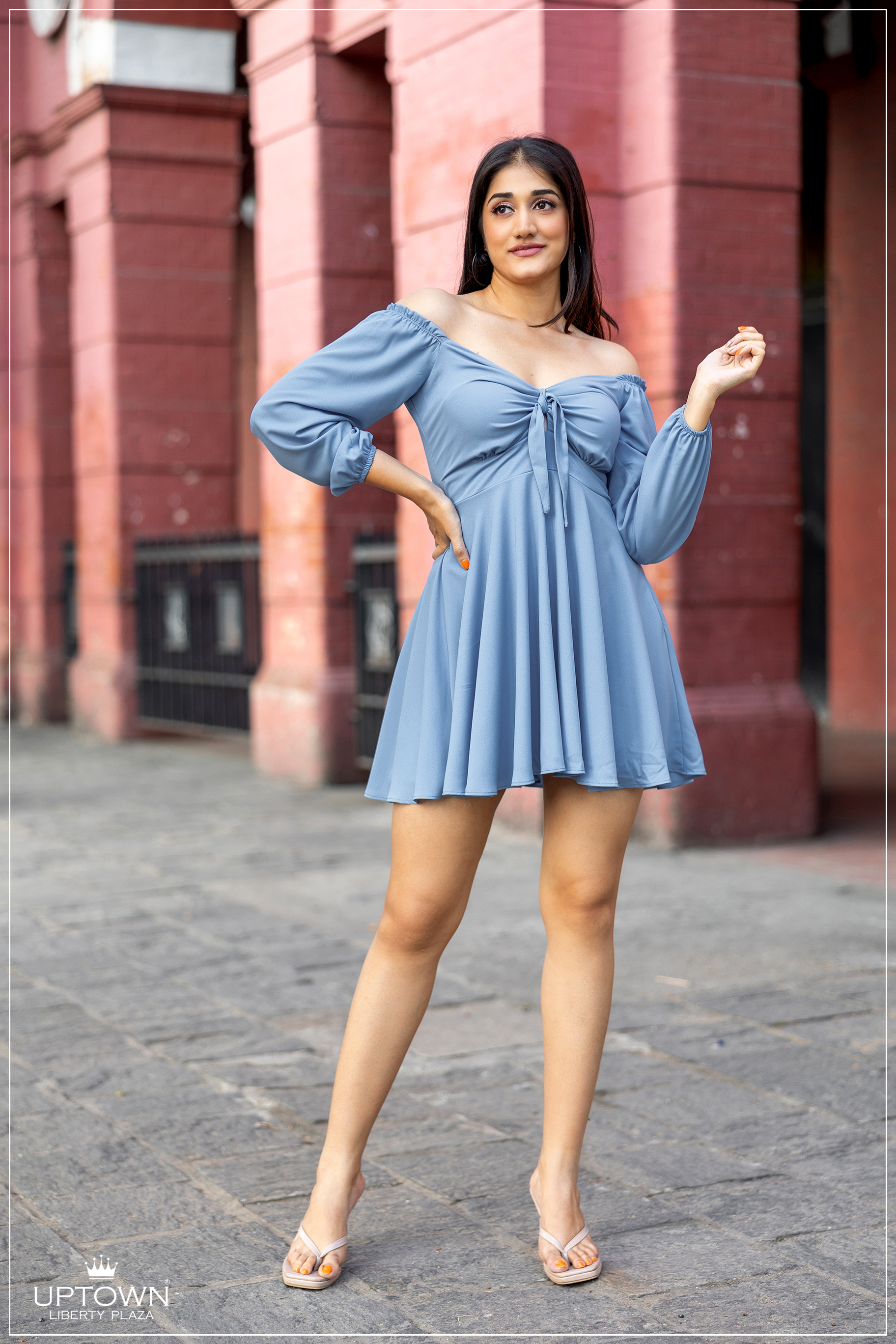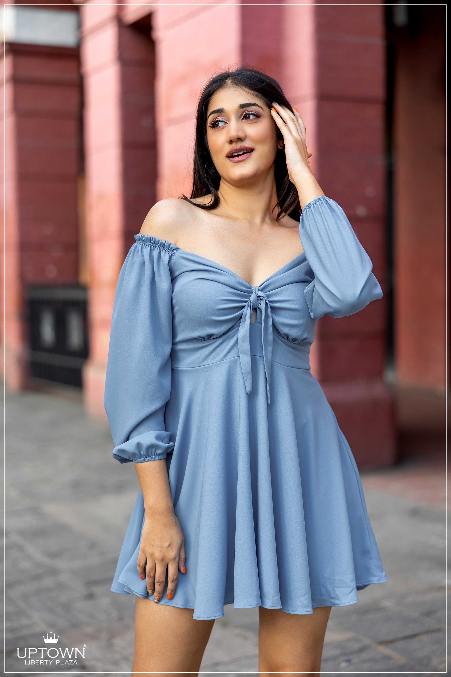 UP 4716 - PNP OFF SHOULDER FRONT KNOT FLARED MINI DRESS quantity